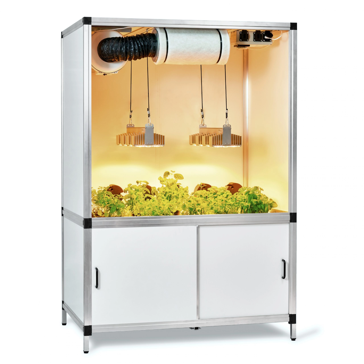 Toch is de CNNBS G-Kit XL CMH nog steeds discreet te noemen. De kast is 118 centimeter breed, 78 centimeter diep en 176 centimeter hoog maar hij oogt nog altijd als een doorsnee kast. Daarnaast ruik je buiten de kweekkast niets van je wietplanten, dankzij het ingebouwde koolstoffilter. Dit is de Prima Klima K2601 die goed is voor een luchtafvoer van 360 kubieke meter per uur.