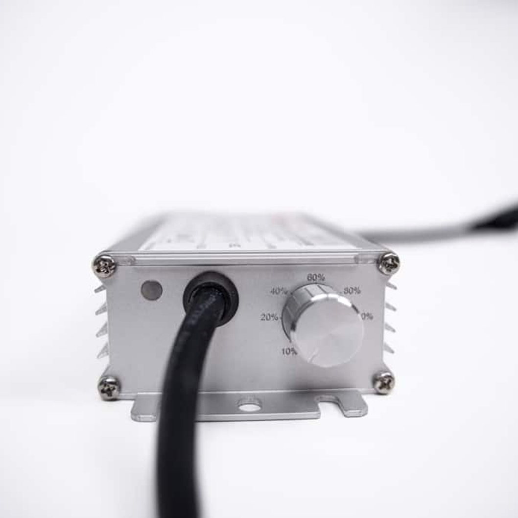 Dat betekent dat elke Watt die je in de lamp stopt, optimaal wordt omgezet in nuttig plantlicht (PAR - Photosynthetically Active Radiation). Het breedband lichtspectrum (400–780 nm) dekt zowel de groei- als bloeifase volledig af, en de lamp wordt standaard dimbaar geleverd. Je kunt stapsgewijs dimmen in zes stappen: 10% – 20% – 40% – 60% – 80% – 100%.